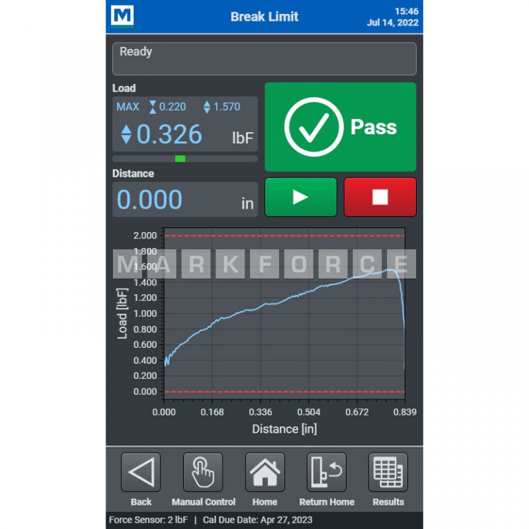 Test můžete spustit pomocí standardní, grafické nebo výsledkové karty a podle potřeby přepínat zobrazení. Indikátor Pass/Fail snadno identifikuje problematické vzorky. Jednotlivé běhy mohou být znehodnoceny, pokud například přípravek vyklouzne z úchopů nebo byl test přerušen.