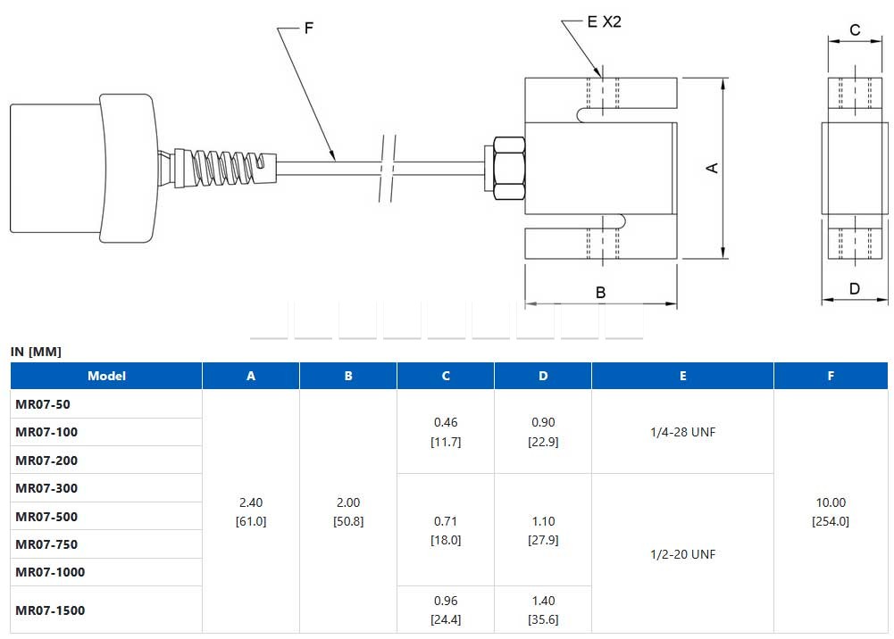 Snímače síly řady MR07 měří tahové a tlakové síly a jsou určeny pro testovací rámy řady F. Díky technologii Plug & Test® jsou veškerá konfigurační a kalibrační data uložena v senzoru, což umožňuje jeho kalibraci na testovacím rámu nebo mimo pracoviště pomocí indikátoru Mark-10. Dostupné rozsahy od 250 N do 7,5 kN [50 až 1 500 lbF].